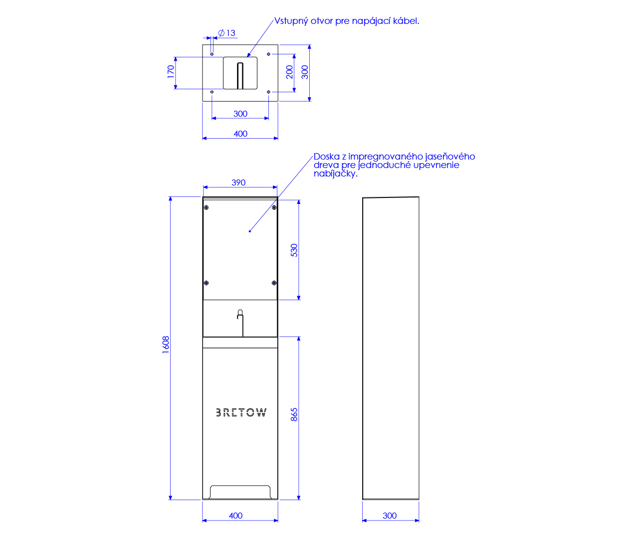 Skrinka z ocele nalakovaná kvalitnou a odolnou práškovou farbou. Doska na uchytenie nabíjačky je z impregnovaného odolného jaseňového dreva. Stojan je určený pre široký rozsah nabíjačiek do rozmerov 300x500x250mm. Montáž stojanu sa vykonáva uchytením do pevného podkladu oceľovými kotvami ktoré sú súčasťou balenia. Prívod elektrickej energie ku stojanu sa vedie otvorom odspodu stojanu.Vyrobené v EU